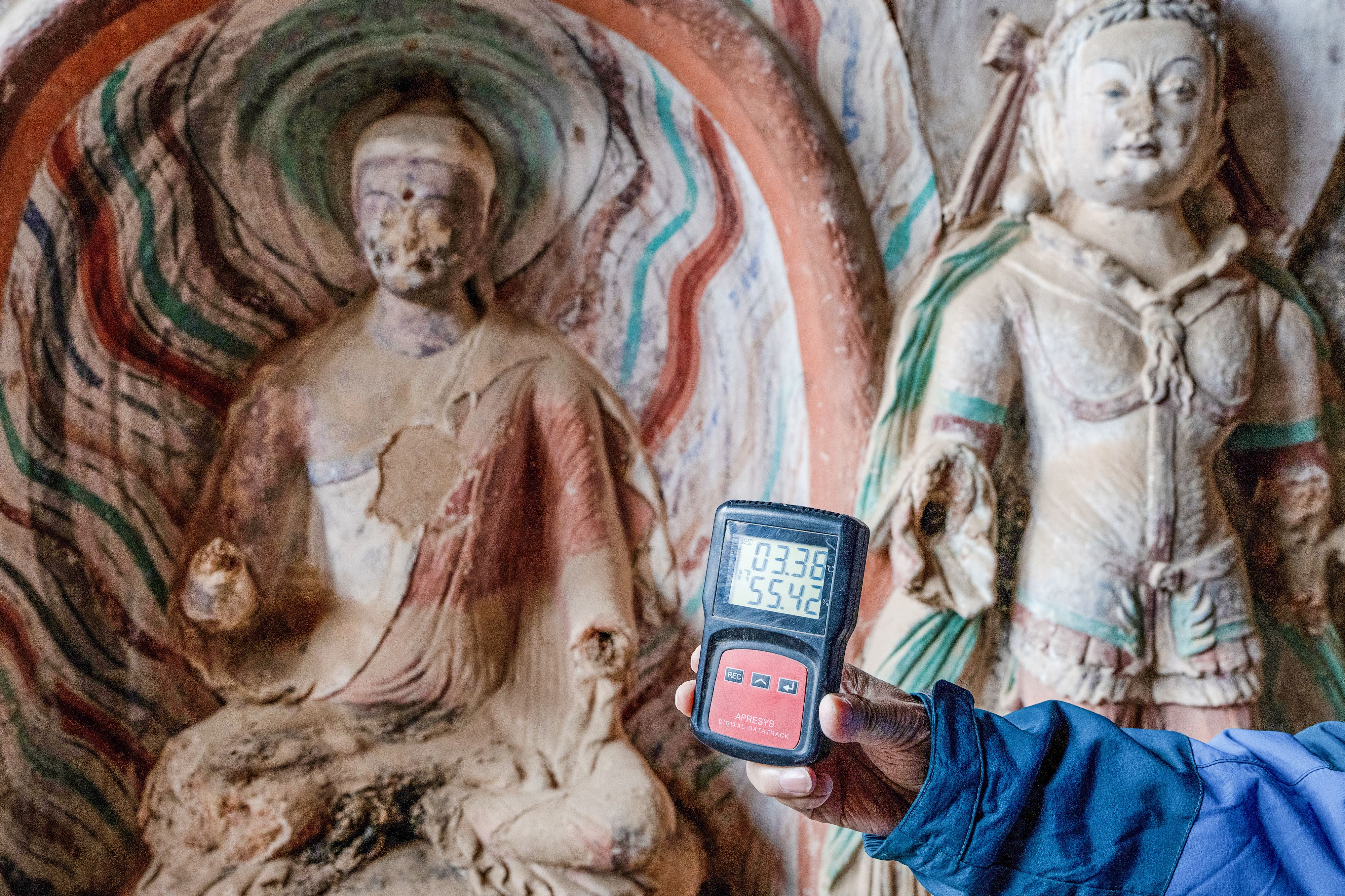 Yet, amid the awe-inspiring beauty, an unsettling reality becomes apparent. Even these cultural treasures are not immune to climate change. Yan Tu, seeing a hygrometer showing 55% humidity inside the cave, is worried that if the artefacts were exposed to such conditions for a long time, the earthen wall structure the murals are attached to will become loose and deformed while the paint will gradually peel off. Other cultural pieces inside the cave have suffered the same fate, with faded colours and broken limbs, an injustice to their original beauty.