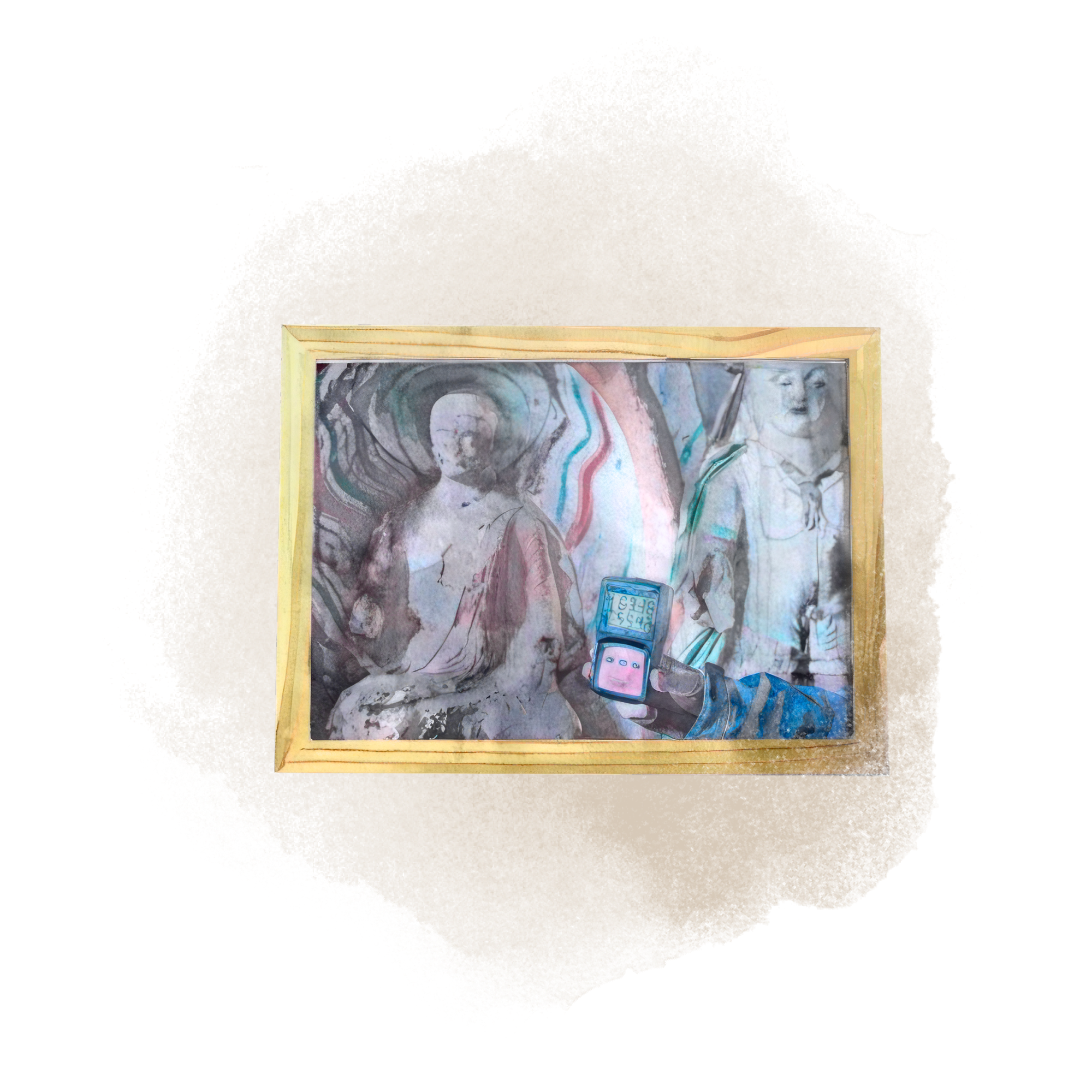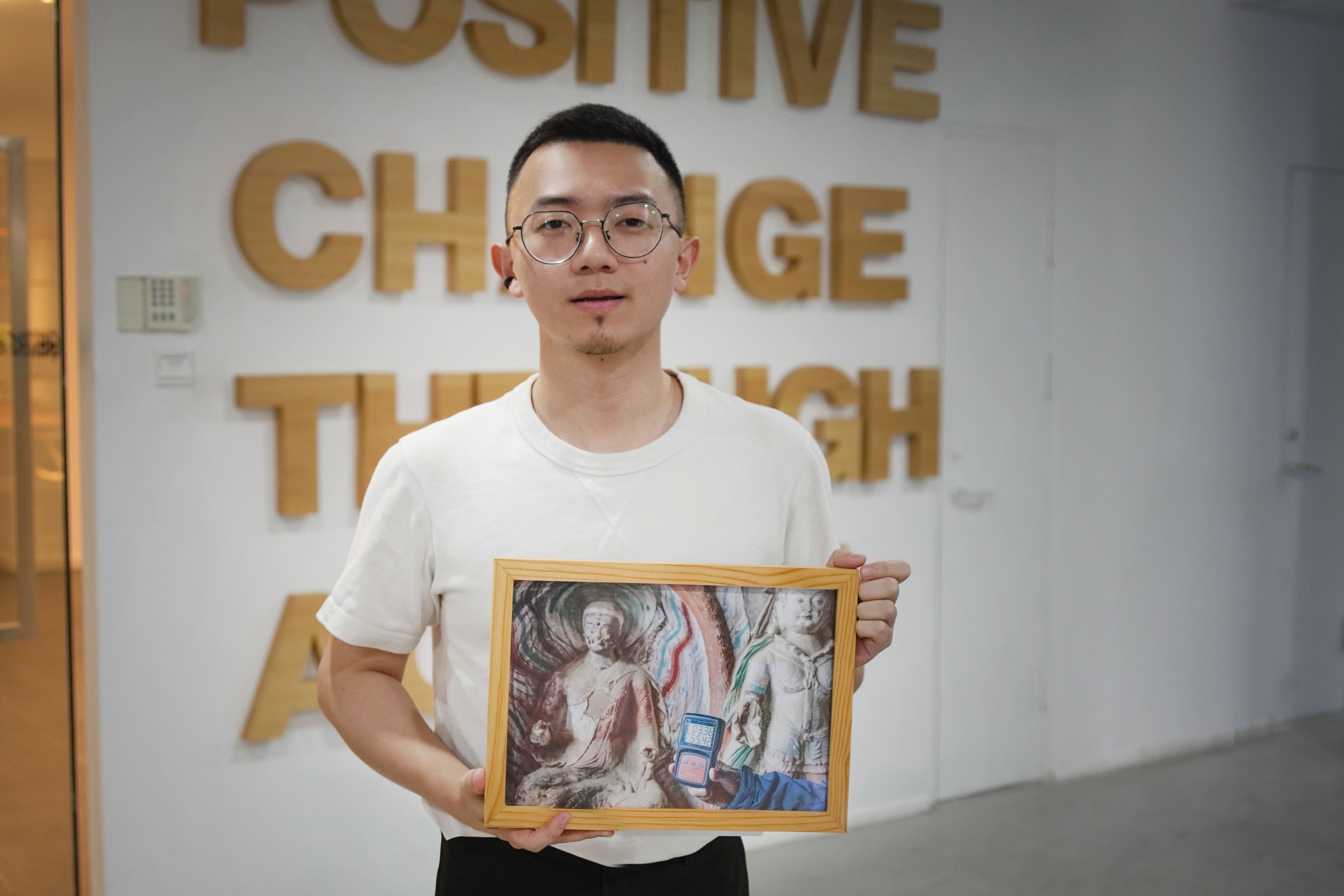 A photo of a decaying Buddha statue at the Jinta Temple in Gansu. The picture also contains a hygrometer reading of 55% humidity inside the cave at 3 degrees Celsius. It reminds Yan Tu that precious cultural heritage, as well as nature, is at risk because of climate change.